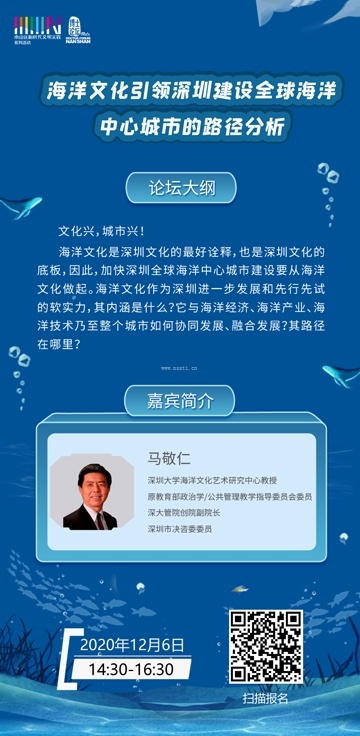 文化兴,城市兴!海洋文化是深圳文化的做好的诠释,也是深圳文化的底板,因此,加快深圳全球海洋中心城市建设要从海洋文化做起。海洋文化作为深圳进一步发展和先行先试的软实力,其内涵是什么?它与海洋经济、海洋产业、海洋技术乃至整个城市如何协同发展、融合发展?其路径在哪里?由深圳大学海洋艺术研究中心顾问马敬仁教授对标深圳全球海洋中心城市建设及大湾区的发展与大家做一个快乐的分享。