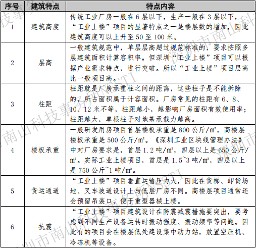 一是建筑特点,“工业上楼”项目在设计上与低层厂房和商务办公楼有着截然不同的特点,具体表现在建筑高度、层高、柱距、楼板承重、货运通道及抗震设计上,具体内容如下表所示。除此之外,“工业上楼”项目在防火疏散、设备管井、电压、强弱电、排污等设计上也比低层厂房项目难度更大,要求更高,因此工程造价一般较高。