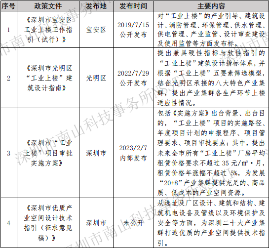 据资料显示,深圳当前已有政策与标准中,与“工业上楼”相关的共有4份,其中2份来自市里,1份来自宝安区,1份来自光明区;从政策约束力来看,3份属于指引性文件,1份属于指导性文件;从政策内容上来看,主要是对“工业上楼”项目产业引导、建筑设计及审批机制做相应规范和指引建议。