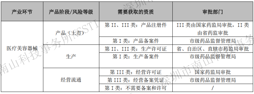 在中国,医疗美容器械受国家药品监督管理局及其地方机构监管;医疗美容服务属于医疗服务行为,受国家卫生健康委员会及其地方机构监管。其中,医疗美容器械从产品上市到生产流通所需要的相关资质及其对应的监管部门如下:
