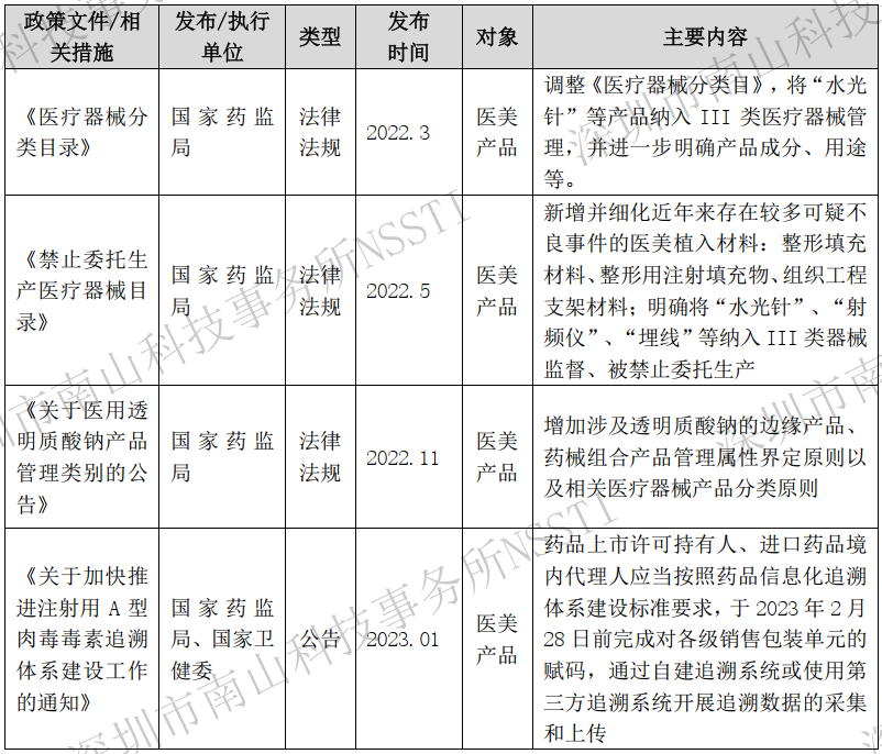 发展至今,医美行业监管体系越发完善。2022年,国家药监局调整了《医疗器械分类目录》,将“水光针”“射频治疗仪”“面部埋植线”等多款医美产品纳入III类医疗器械管理;5月,国家药监局组织修订了《禁止委托生产医疗器械目录》,要求“整形填充材料、整形用注射填充物、乳房植入物、组织工程支架材料”产品禁止委托生产;2023年初,《关于加快推进注射用A型肉毒毒素追溯体系建设工作的通知》体现对肉毒素的生产流通加强监管。至此,医疗美容器械注册、生产与流通监管进一步得到规范。