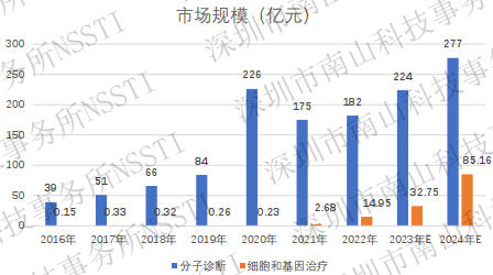 图2:2016-2024E全球分子诊断和细胞基因治疗市场规模(亿美元)