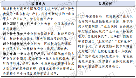 北京发展重点为“2441”体系(高精尖产业2.0升级),即两个国际引领支柱产业分别为新一代信息技术和医药健康,四个特色优势产业分别为集成电路、智能网联汽车、智能制造与装备、绿色能源与节能环保,四个创新链接产业分别为区块链与先进计算、科技服务业、智慧城市产业、信息内容消费,一批未来前沿产业(详见表2)。