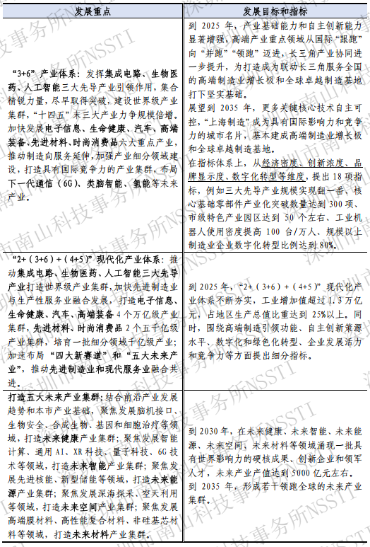 上海发展重点为“3+6”产业体系,即集成电路、生物医药、人工智能三大先导产业,电子信息、生命健康、汽车、高端装备、先进材料、时尚消费品六大重点产业,下一代通信(6G)、类脑智能、氢能等未来产业。同时,上海结合新发展趋势,将发展重点细化为“2+(3+6)+(4+5)”现代化产业体系,并相应地优化完善制造业发展任务举措(详见表3)。