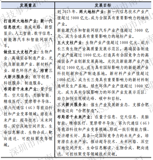 合肥市发展重点为两大地标产业:新一代信息技术(集成电路、新型显示、人工智能、数字信息)、新能源汽车和智能网联汽车;五大支柱产业:生物产业、高端装备制造产业、光伏及新能源产业、新材料产业、绿色环保产业;三大新兴服务业:数字创意、科技服务、制造服务;布局若干未来产业(详见表5)。