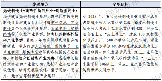 成都市发展重点为先进制造业+战略性新兴产业+创新型产业。先进制造业集群:电子信息、装备制造、集成电路、智能终端;战略性新兴产业集群:人工智能、柔性电子、卫星互联网、超高清显示等;创新型产业集群:区块链、量子通信、光芯片、元宇宙等(详见表6)。