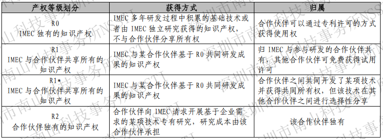 ——“产业联盟项目”多边合作体系。IMEC在1991年创立了产业联盟项目(IIAP)计划,是与全球企业开展联合研究的合作模式,被公认为国际微电子界研发合作最成功的模式。产业联盟项目通常联合全球几十家知名企业,形成多学科大团队的协作关系,聚力开展领先市场3-8年的项目研究,以攻克在产业应用中的技术瓶颈。该项目模式的关键在于建立了权责清晰的合作规则,充分考虑了参与研发的各利益主体对于知识产权归属方面的诉求,对联合项目研究成果预期产生的知识产权进行严格的分类管理,有效地帮助IMEC增强全球产业优势资源的整合能力。
